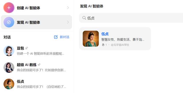 打开豆包,点击“发现智能体”,搜索“伍贞”,撩吧