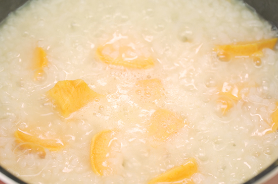 2、起锅烧水,水烧至六七成热倒入大米和红薯块大火烧开。