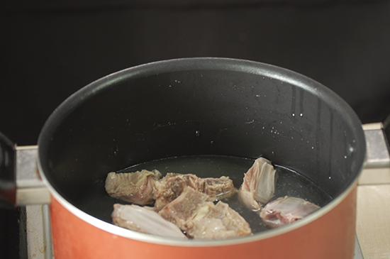 3、羊肉下锅,加水大火煮开后,撇去煮出来的血沫大火重新煮沸,反复几次直到糖水清澈,再放入姜片和葱段中小火盖锅炖1小时。