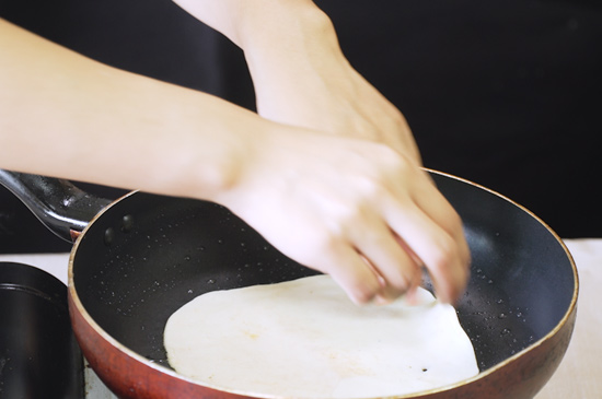 5、起锅刷一层油,面饼放入锅内小火煎制。一面凝固后,翻面继续煎制。