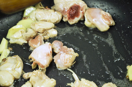 2、起锅烧油,油热后放入花椒炒出香味,再放入鸡块和姜片大火爆炒至鸡块表面水分炒干出油。