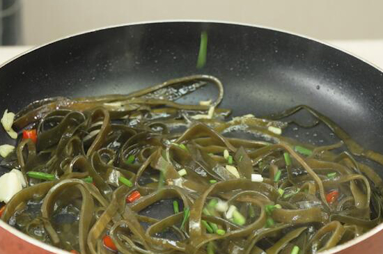 起锅烧油放入切好的小米椒、姜和蒜炒出香味后,把处理好的海带丝放入翻炒2分钟,再依次加入精盐、胡椒粉、鸡精,沿着锅边缘淋入白醋,撒上葱末后,一份美味的酸溜海带丝就做好了。