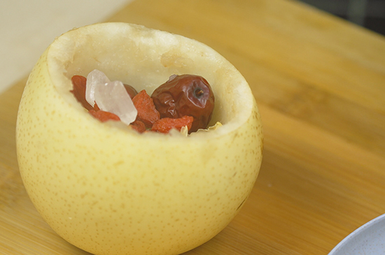 制作冰糖雪梨需要先把雪梨清洗干净,雪梨顶部切掉,挖空中间后,把银耳、红枣、枸杞、冰糖与适量清水放入里面,最后放入蒸锅内开盖蒸25~30分钟左右,即可做成一份美味可口的冰糖雪梨。
