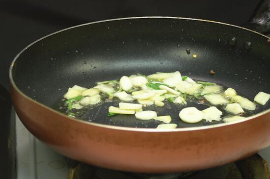 4、往锅内加入少量油,放入花椒粒、干辣椒炒出香味后捞出,把葱姜蒜放入爆香后,再放入一勺豆瓣酱炒出红油。