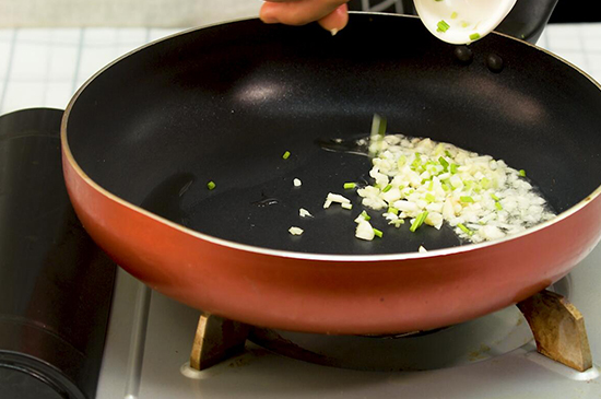 2、起锅倒入适量调和油,油温至3~4成热时倒入小葱和蒜蓉炸出香味。