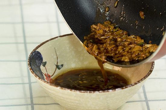 3、往里面加入适量蒸鱼鼓油、少量料酒,翻炒几分钟后捞出锅内料汁用小碗装好。