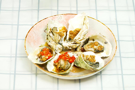 5、最后将每个生蚝的壳打开,往里面浇上料汁并撒上少量蒜蓉剁椒酱,清蒸生蚝就制作完成。