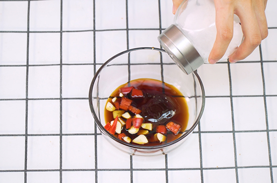 4、在碗中倒入切好的食材,加入生抽、耗油、白砂糖搅拌均匀。