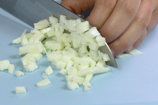3、将蒸好的蛋白切成小丁状,起锅烧油倒入蛋黄。