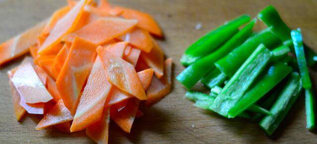 用料:猪肉300克,胡萝卜50克,干木耳8克,青椒1个,蒜2瓣,酱油1汤匙,料酒1汤匙,淀粉1茶匙,盐1小勺。