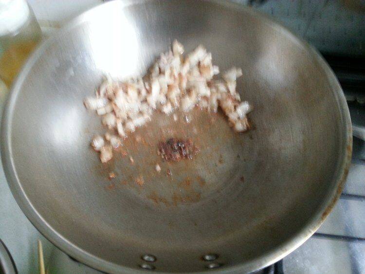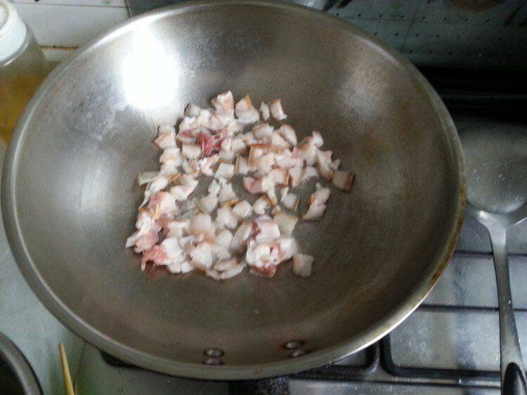 4、热锅凉油,油热后下入肥肉片煸炒至出油。