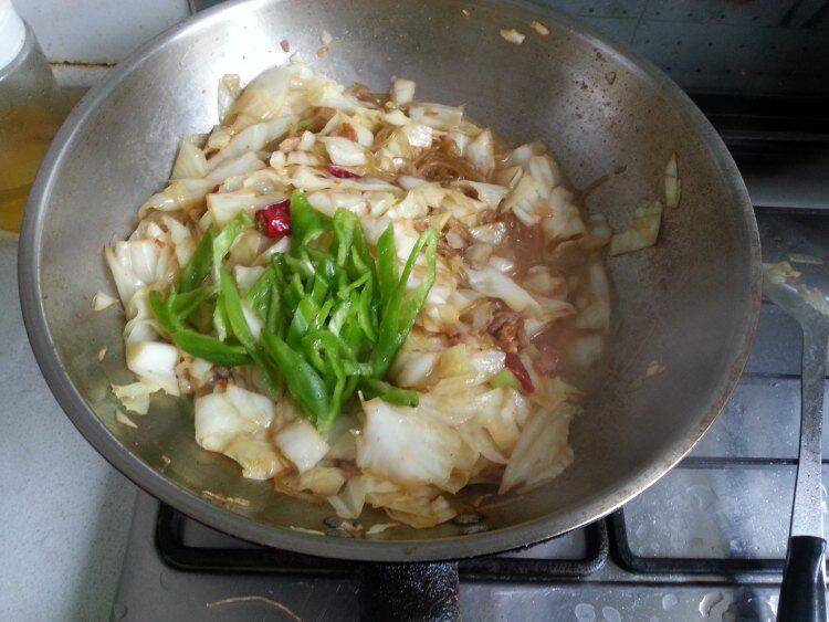 6、下入葱姜和辣椒炒香,倒入圆白菜翻炒。