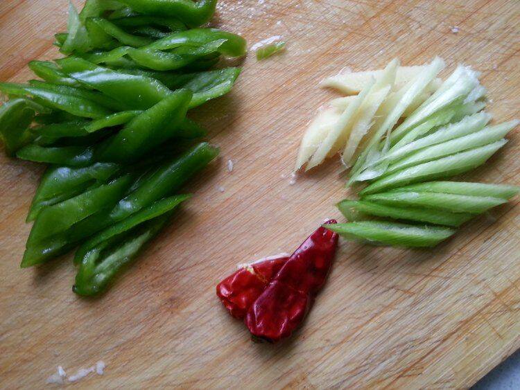2、葱姜切丝,干辣椒切段,青椒切丝。