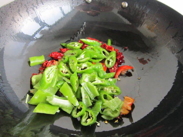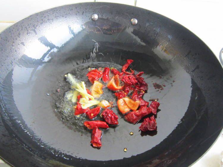 5、热锅凉油,油热8成,下花椒粒、辣皮子、姜炒出香味。