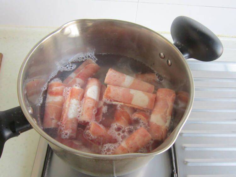 4、把煮锅加水烧开,下肥牛煮开捞起沥干水分。