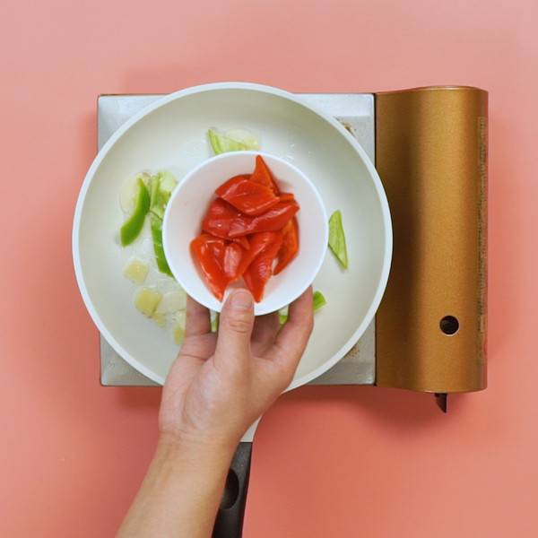3、倒入青红椒加调料翻炒均匀。