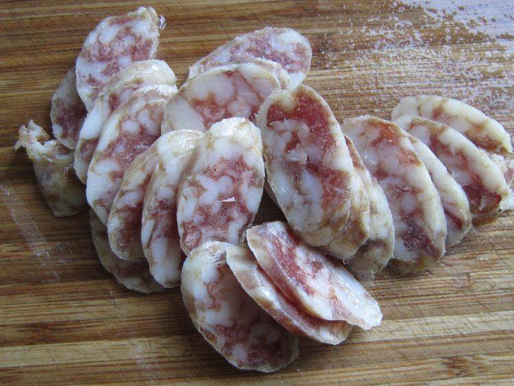 1、食材准备:腊肠1根、儿菜半颗、油、盐、生抽、料酒、大蒜、辣椒各适量。