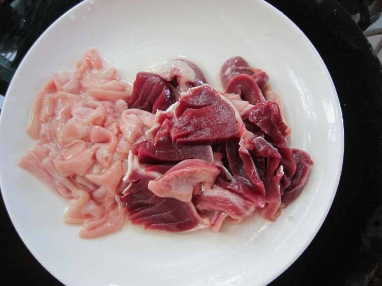 2、把鹅胗,鹅心,鹅肠用面粉和醋反复洗干净后切小块。