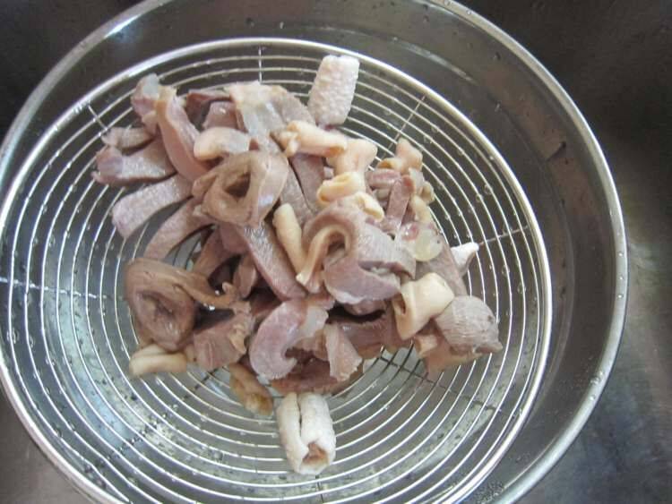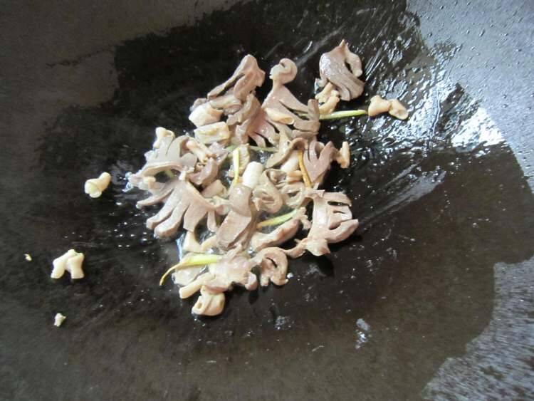 5、热油锅爆香姜丝后把鹅胗,鹅心,鹅肠下锅爆炒。