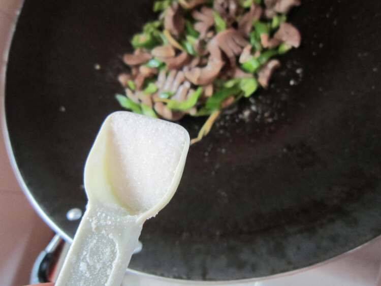 9、加入适量盐炒至辣椒断生即可。