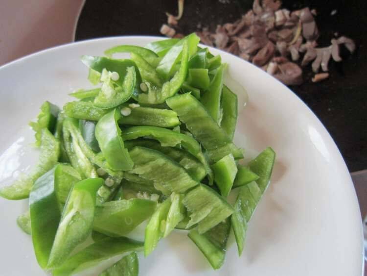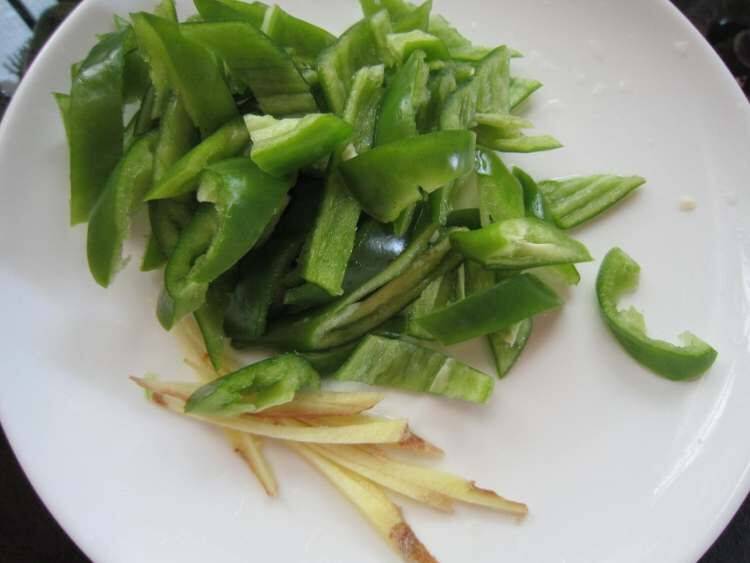 4、青椒去籽切斜刀块,生姜切丝。
