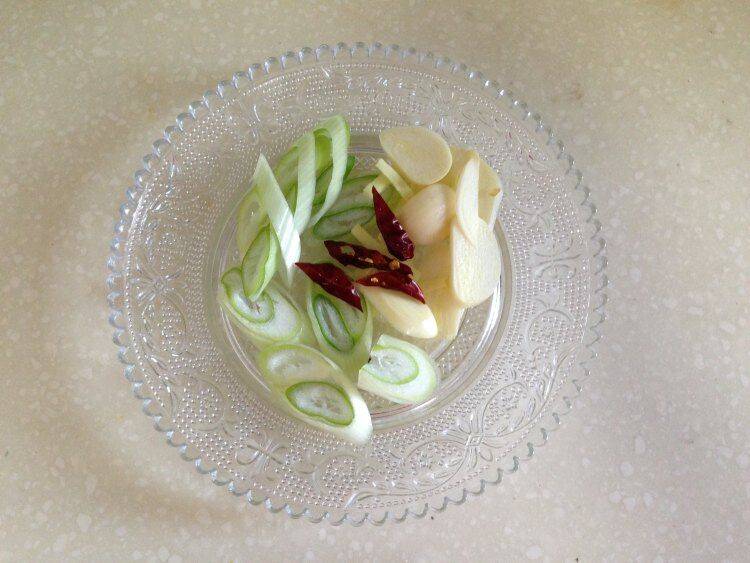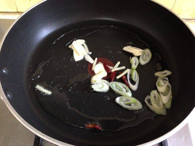 4、锅内加油烧热,放入葱姜蒜和辣椒炒香。