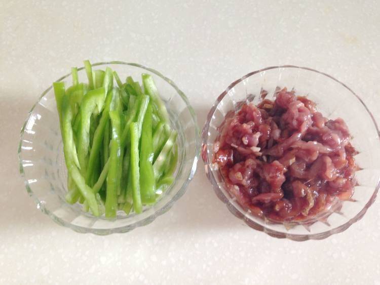 1、青椒洗净切丝,瘦肉切丝,放入少量盐、老抽和料酒腌制10分钟。