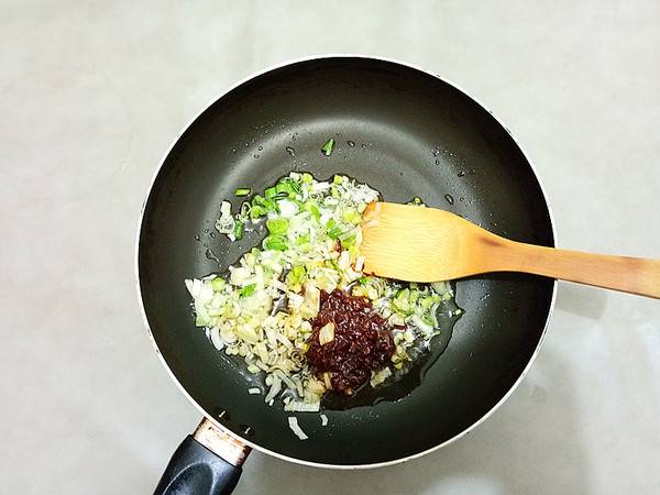 3、锅中放少许底油,放入葱末和一半的青蒜末小火炒出香味后,放入豆瓣酱炒出红油。