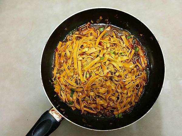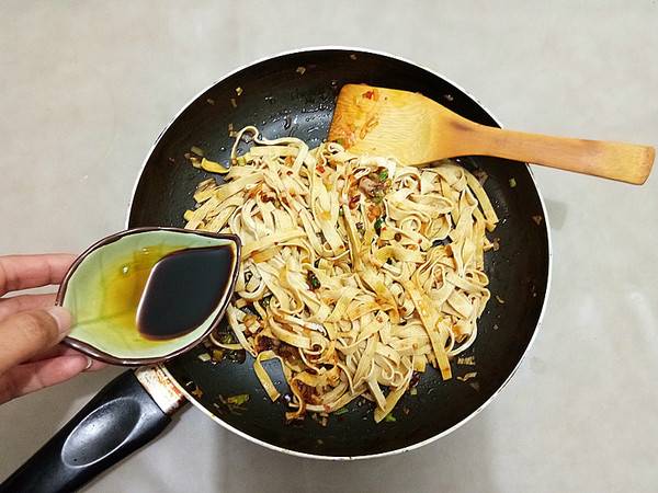 4、炒出调料香味后,放入焯过水的豆皮,翻炒至豆皮上色,加入红烧酱油,白糖翻炒均匀。
