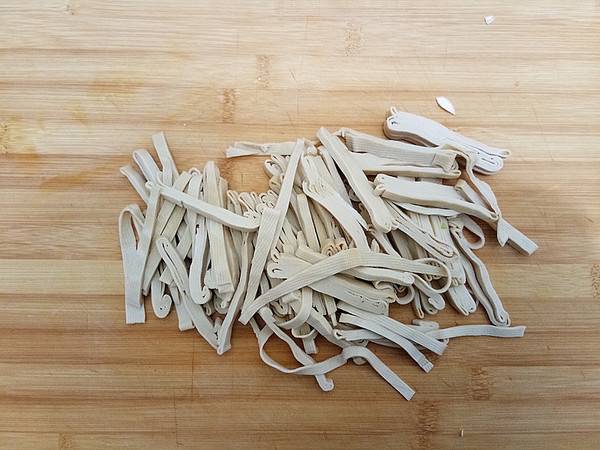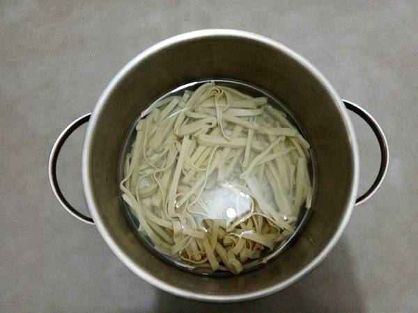 2、锅中烧至水沸,放入切好的豆皮煮1分钟去除豆腥味。