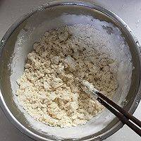 2、将面粉倒入容器中,加热水用筷子搅成絮状。