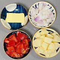 4、准备一块黄油,西红柿、洋葱、土豆和胡萝卜分别均匀切块。