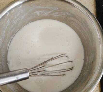 3、将熟浆倒入之前的粉浆中混合均匀。放置两小时。可以过筛一遍。