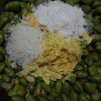 5、将捣好的生姜、盐、糖,一起放入捣好的青橄榄中,用手搅拌均匀。