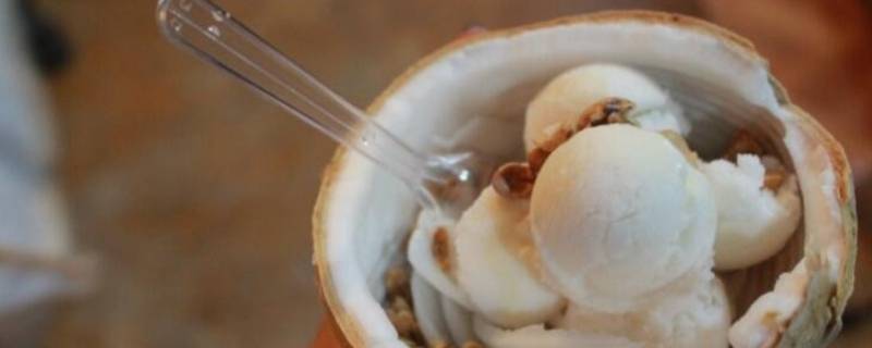 1、椰子冰淇淋。椰子在泰国是十分便宜的水果,椰子的衍生品也非常之多,椰子冰淇淋就是其中一种,用半个椰子壳作为容器,雪白的冰淇淋球上洒满椰肉和炒花生,走在街上又好玩又好吃。