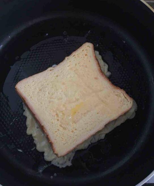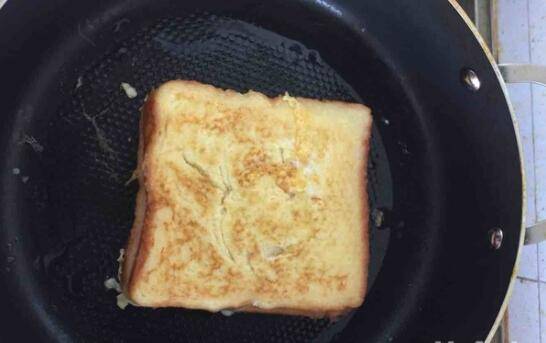 8、炒锅刷微量油,开小火,将面包片沾满牛奶蛋液放入锅中煎制。