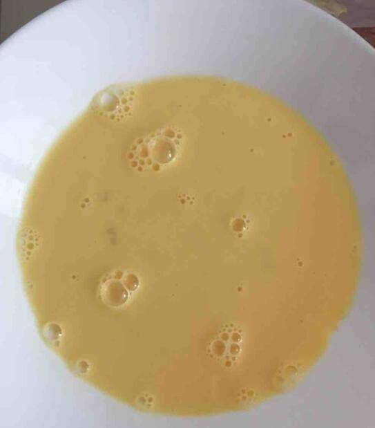 7、打散一个鸡蛋并调入牛奶搅拌均匀。