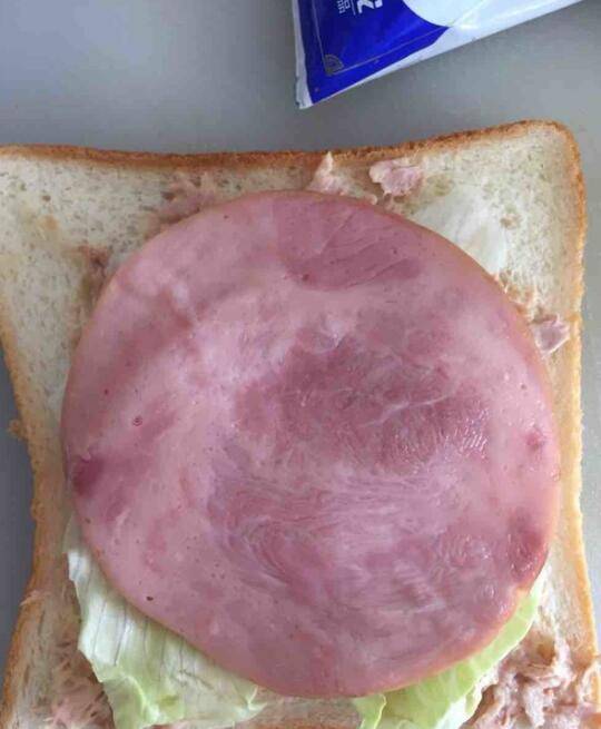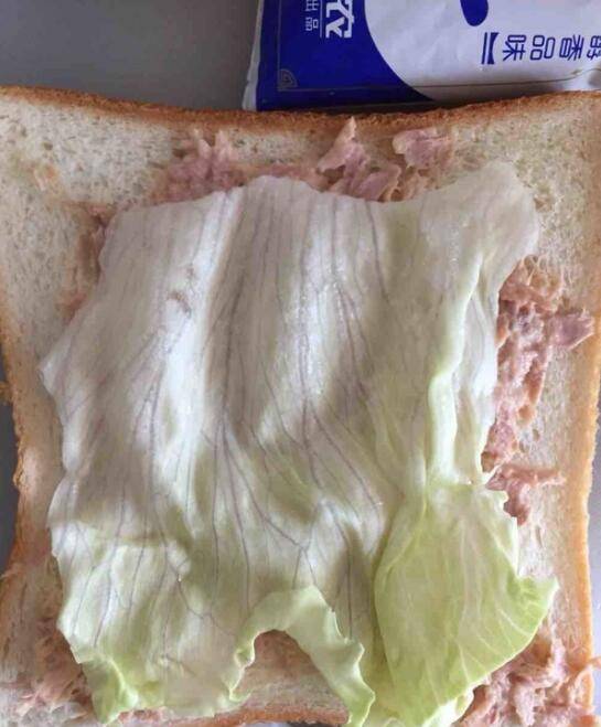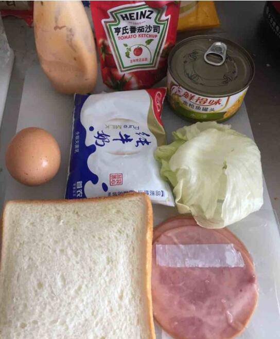 1、准备材料:面包片2片、火腿3片、金枪鱼罐头1勺、鸡蛋1个、牛奶适量、生菜1片、千岛酱1茶匙、番茄酱1茶匙。