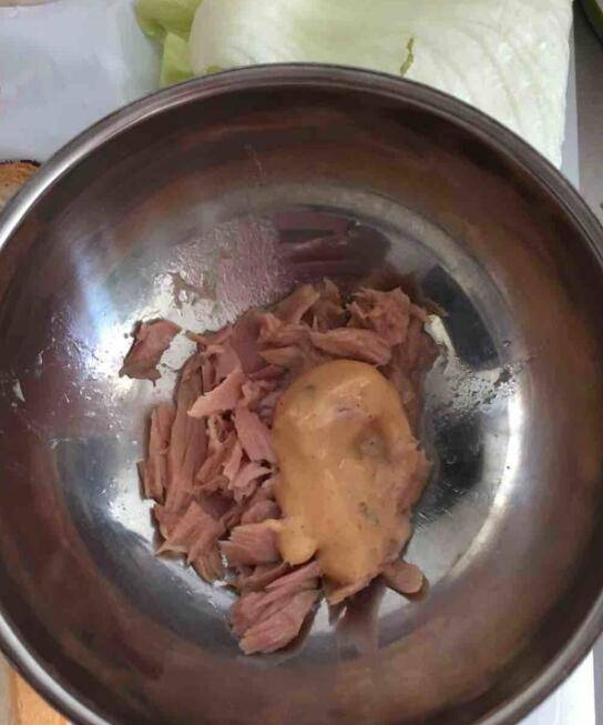 2、将千岛酱和金枪鱼搅拌均匀并捣碎。