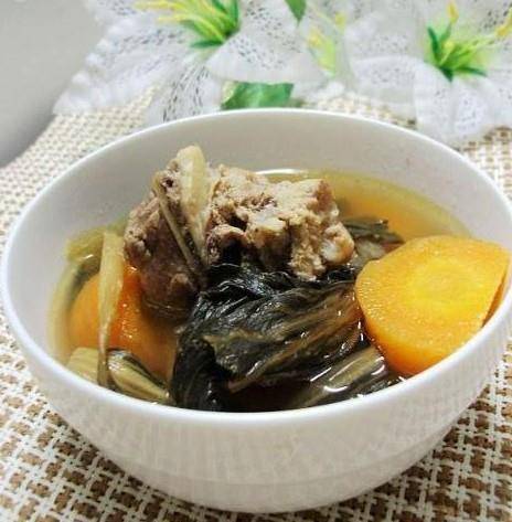 2、菜干猪骨汤:菜干预先泡上1~2个小时,然后切成小段,锅中倒入清水、猪骨、蜜枣、姜片,大火烧开,转成小火慢煲一个半小时即可。