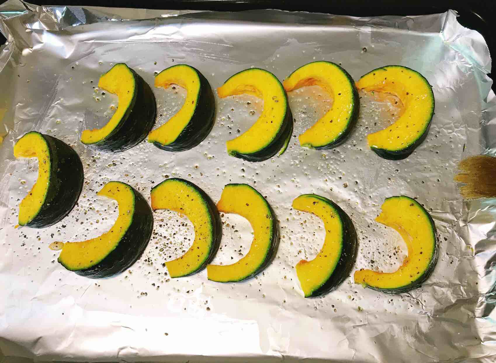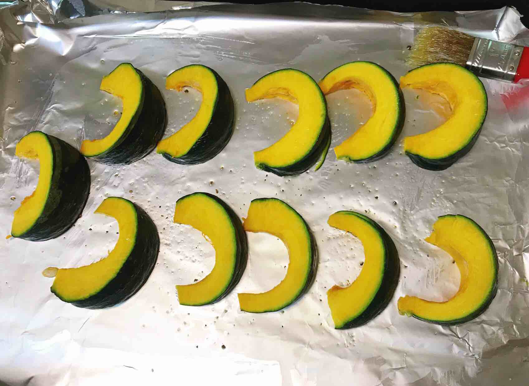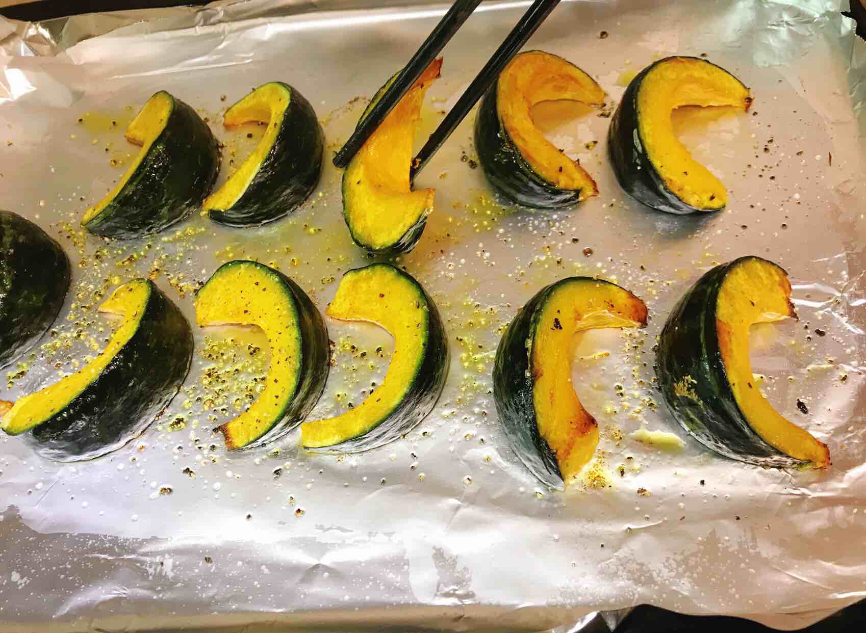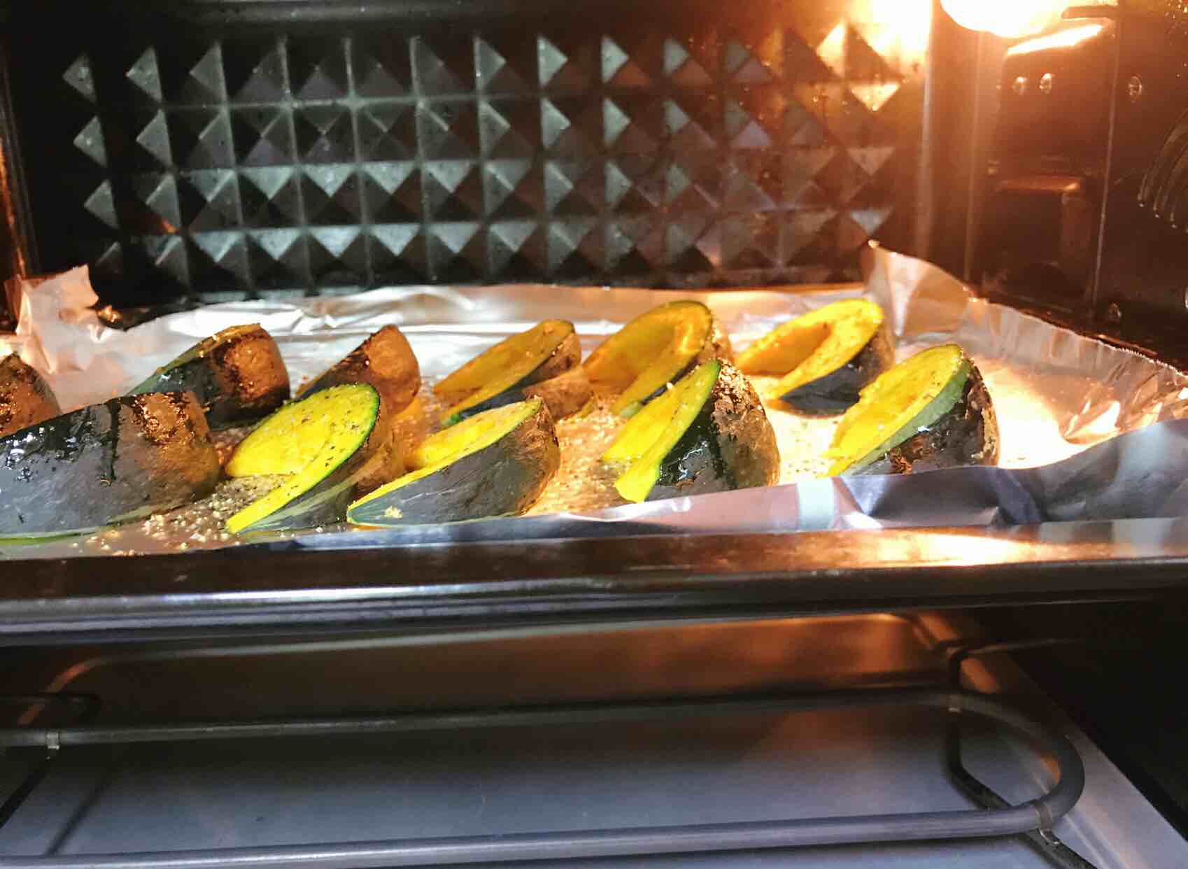 8、中途12分钟左右,将贝贝瓜翻一下面,继续放入烤箱烘烤,直到其熟透为止。