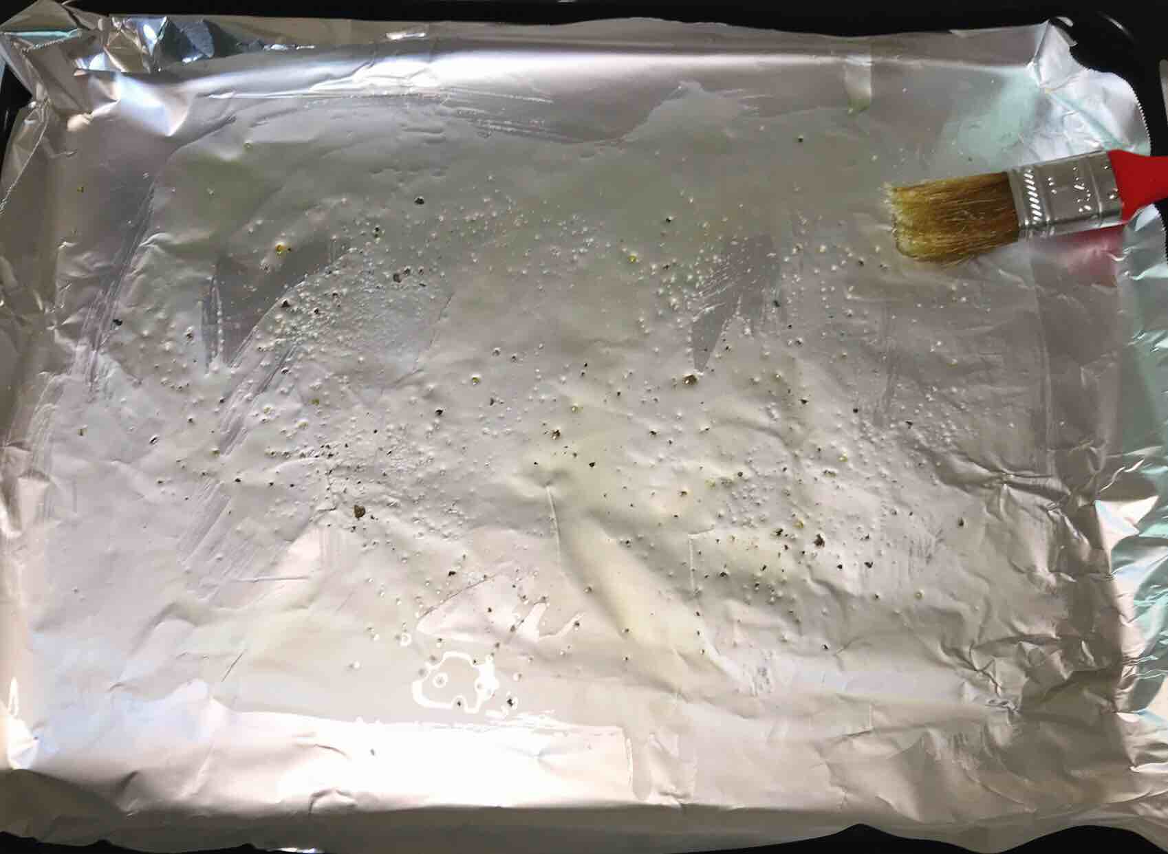 4、烤盘铺上锡纸刷一层橄榄油,撒少许盐和黑胡椒粉。