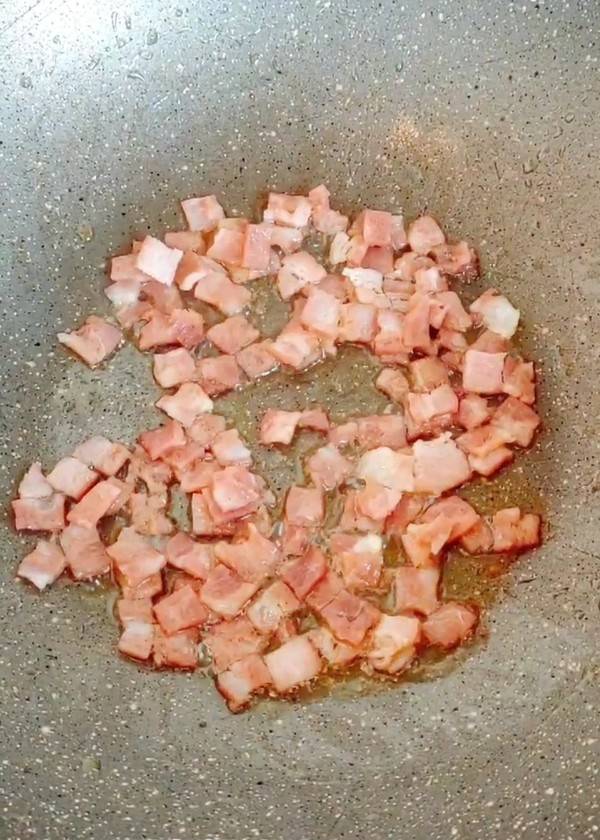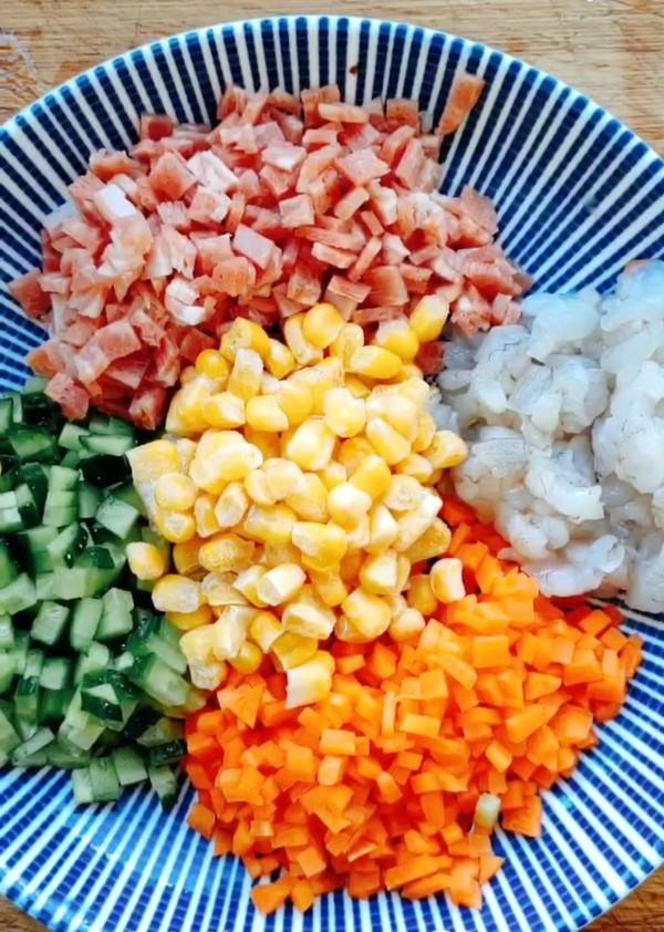 2、虾仁、培根、胡萝卜、黄瓜、玉米切粒。