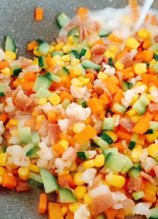 6、再倒入胡萝卜、玉米粒、虾仁粒、黄瓜粒。