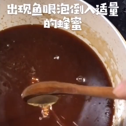 5、不停加热搅拌至出现泡泡,滴入蜂蜜。