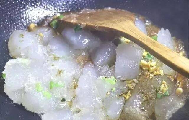 8、下入红薯粉块,中火炒至表面起锅巴。