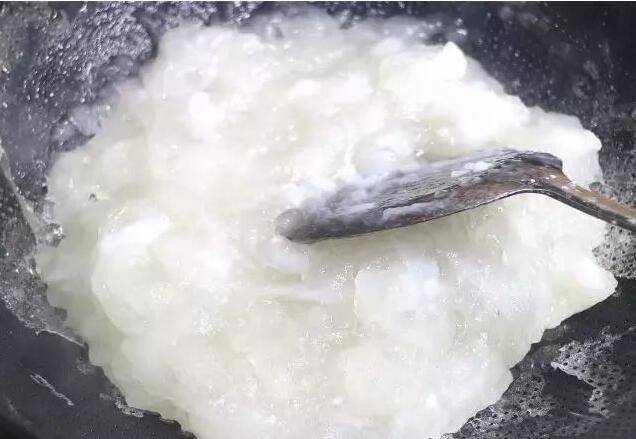 3、800克的水放入锅中烧开,转中小火,缓慢倒入红薯淀粉,边倒边用铲子不停的搅拌至透明色。
