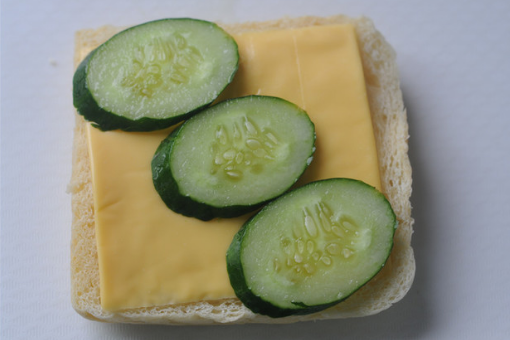 1、准备材料:面包四块、油一勺、盐一撮、鸡蛋两个、香肠一包、芝士几片、黄瓜一根。