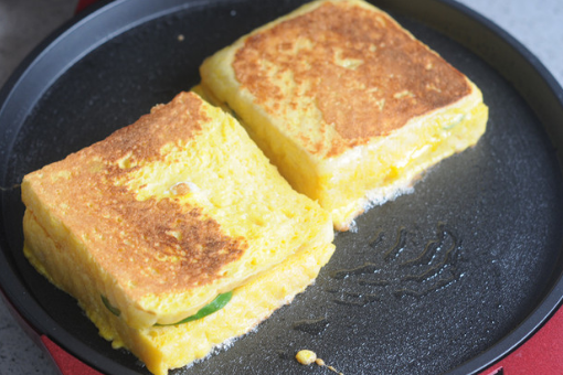 9、将吐司夹放在电饼铛里,盖上盖子,加热后对角切开即可。