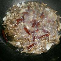 5、放入香菇脚,三分钟后再放干辣椒段。